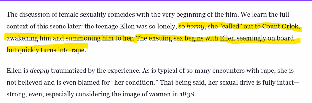 Do I think Count Orlok is a sexual predator who has been grooming Ellen since puberty with the intent to rape her? No, I do not. I personally didn’t interpret Ellen and Orlok’s first sexual encounter in Act One as rape, though I did interpret it as monstrous and horrific, because this is – wait for it – a horror film. I also have not found any interviews or research on the scene that confirms either interpretation, but if someone finds a confirmation, please send it my way.