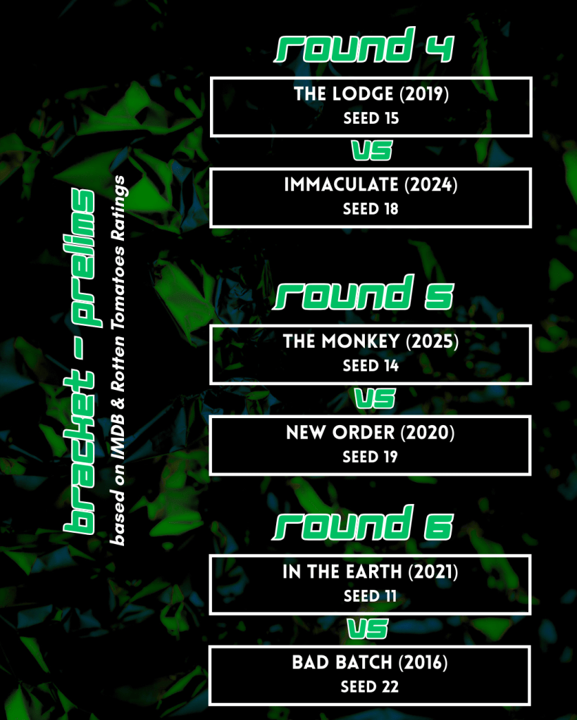 - Bracket: To create the brackets, we pulled a total of 22 horror films from the NEON filmography which were placed into “seeds” based on their IMDB & Rotten Tomatoes ratings. After ranking all of the films, we used a bracket creator, like people do for fantasy football or March madness, which generated our full NEON Cagematch bracket. Check out the full bracket here.