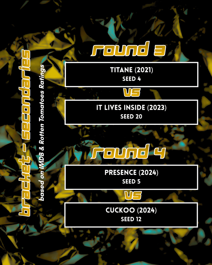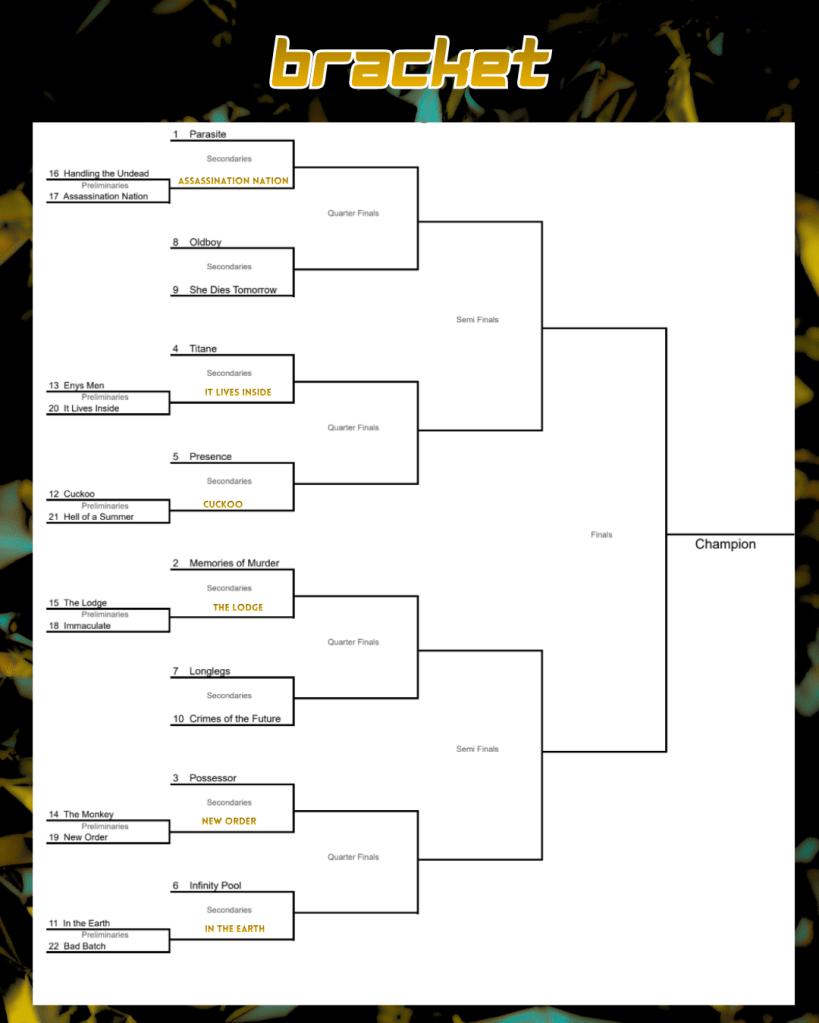 - Bracket: To create the brackets, we pulled a total of 22 horror films from the NEON filmography which were placed into “seeds” based on their IMDB & Rotten Tomatoes ratings. After ranking all of the films, we used a bracket creator, like people do for fantasy football or March madness, which generated our full NEON Cagematch bracket. Check out the full bracket here.